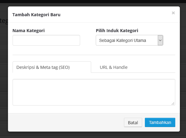 Untuk menambah kategori relatif mudah dilakukan, anda hanya perlu mengisi data yang diperlukan seperti gambar diatas. Jika kategori tersebut merupakan sebuah sub-kategori, maka anda bisa memilih kategori induknya di bagian Pilih Parent (lihat gambar diatas). Lalu tekan tambah. untuk deskripsi meta-tag anda bisa masukan deskripsi kategori anda, contoh: "kategori baju murah meriah"