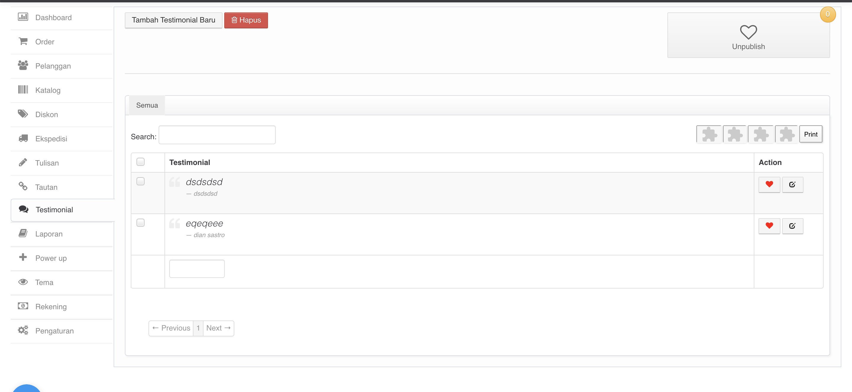 Manajemen testimoial di Jarvis Store sangat mudah, tampilan diatas adalah list dari semua testimonial yang ada, baik yang tampil maupun yang tidak tampil.