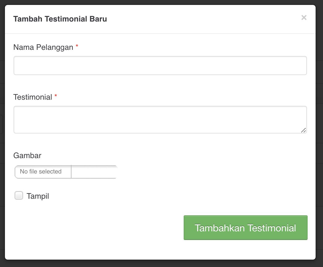 Untuk menambah testimonial, tekan tombol Tambah di kanan atas list testimonial, lalu isi nama pemberi testi dan testimonialnya dikolom yang disediakan seperti gambar diatas dan klik "Tambahkan".